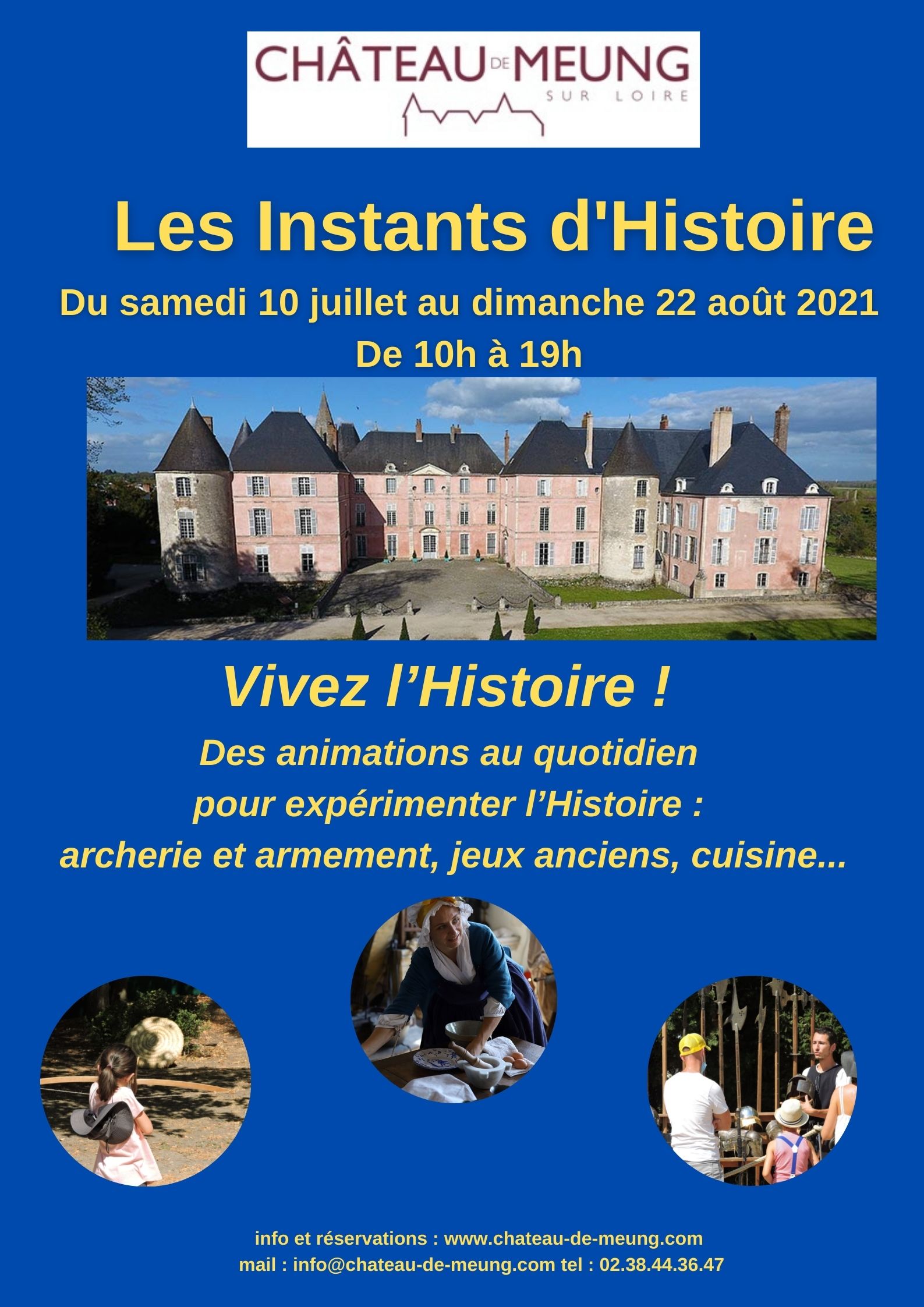 Avec les associations Lowendal (51e de ligne), la 8e de ligne… Château de Meung-sur-Loiredu 17 juillet 2021 au 19 juillet 2021Les Soldats de Jeanne Samedi 17 et dimanche 18 juillet – de 10h à 19h 1429 : les soldats de Jeanne d’Arc ont installé leur campement au pied du château de Meung. Et ne ratez pas l’arrivée de Jeanne d’Arc ! En détail : 10h30 : artillerie 11h30 : entrainement au combat 12h30 : rassemblement de la troupe pour le repas 14h30 : montre d’armes 15h30 : arrivée de Jeanne 16h30 : enrôlement de piquiers (recrutement des enfants !) 17h30 : artillerie Château de Meung-sur-Loiredu 10 juillet 2021 au 23 août 2021Les Instants d'Histoire Du samedi 10 juillet au dimanche 22 août 2021, de 10h à 19h Vivez l’Histoire ! Des animations au quotidien pour expérimenter l’Histoire.Des rendez-vous au quotidien :