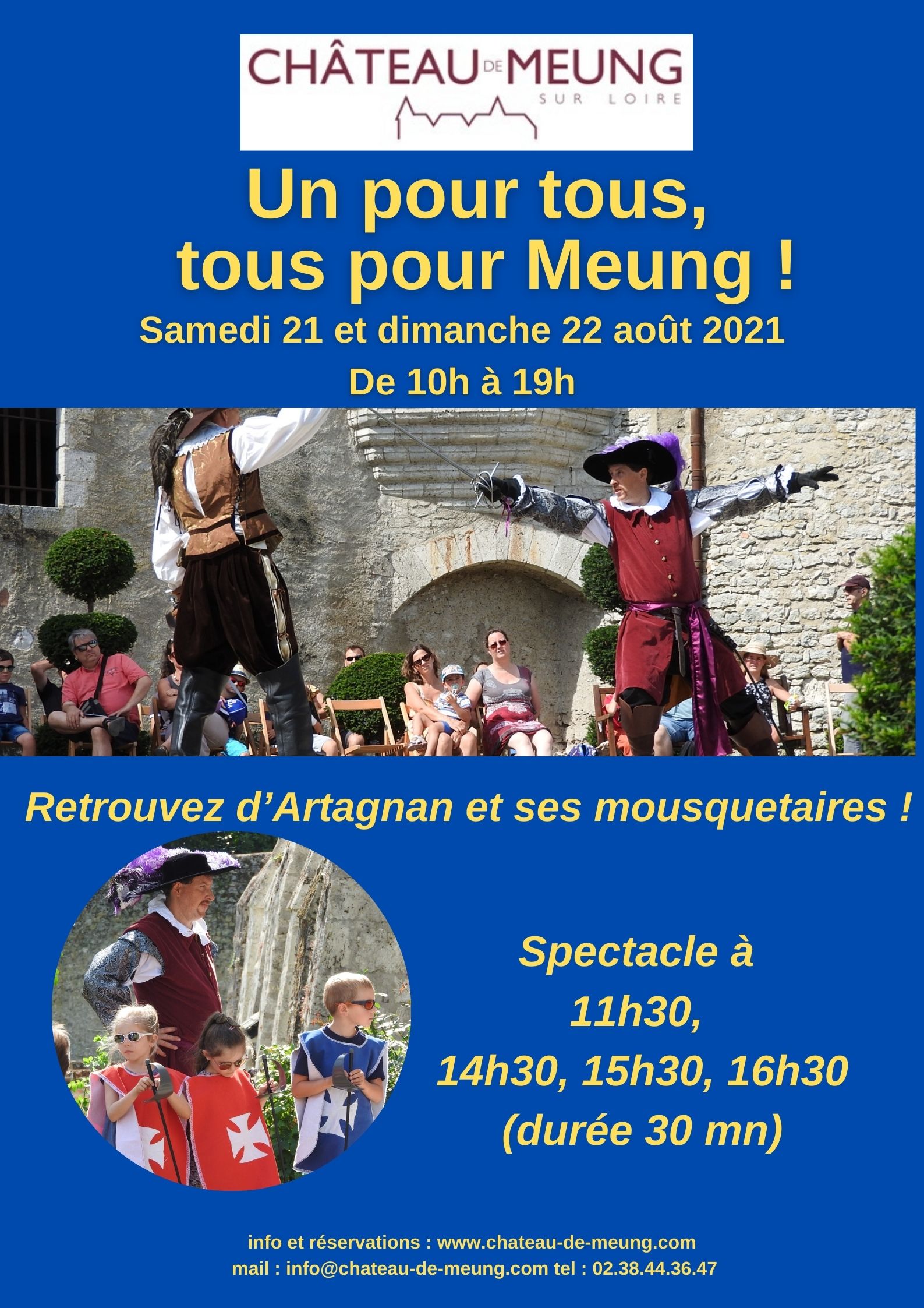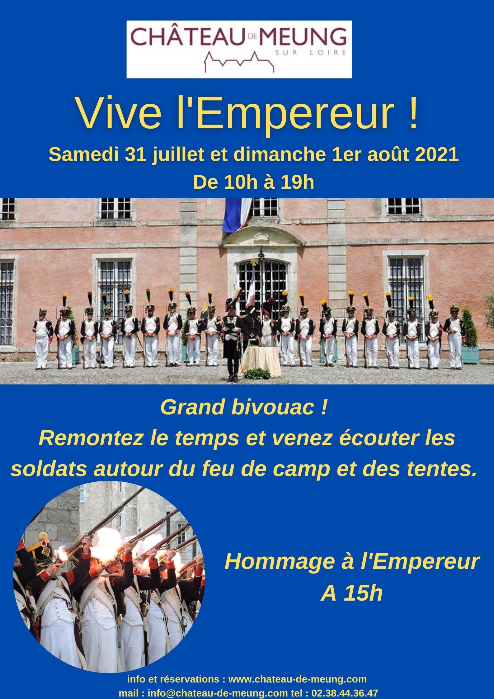 (durée du spectacle : 30mn) Château de Meung-sur-Loiredu 30 juillet 2021 au 2 août 2021Vive l'Empereur ! Samedi 31 juillet et dimanche 1er août 2021– de 10h à 19h