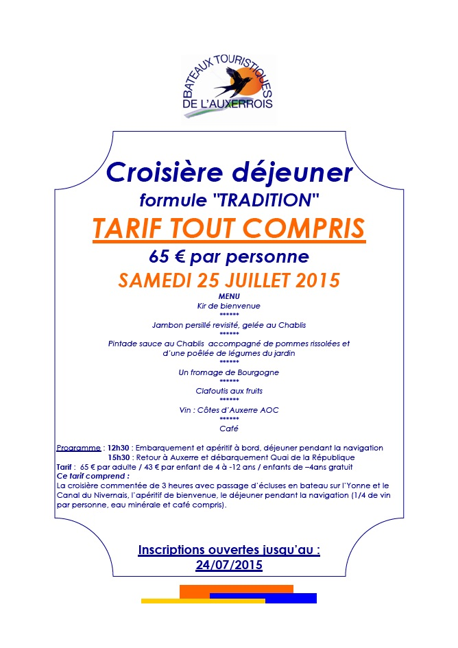 Bateaux touristiques de l'Auxerrois - Croisières "Les jeudis du Goût"du 16 juillet 2015 au 30 juillet 2015![]() Croisières-dégustation à bord de l’Hirondelle 2, à la découverte du Canal du Nivernais, de vins et de produits régionaux ! Départ à 17h précises pour 1h30 de croisière-dégustation. Embarquement : Quai de la République à Auxerre Jeudi 23 Juillet Chitry du Domaine Christine, Elodie et Patrick CHALMEAU à Chitry Terrines de poulet de la Maiterie Christian BONAME à Villers sur Tholon Jeudi 30 Juillet Chablis du Domaine Jean-Marc BROCARD à Préhy Andouillettes et Terrines de la Charcuterie COLIN à Auxerre RESERVATION OBLIGATOIRE Tarifs : 16.90 € par adulte, 10 € pour les 4-12 ans. Gratuit jusqu’à 4 ans Un jus de fruits est prévu pour les –18 ans Château de Storsdu 15 juillet 2015 au 20 septembre 2015Journées européennes du patrimoine Pour la 32e édition des Journées européennes du Patrimoine, le château sera ouvert à la visite les 19 et 20 septembre de 10h à 12h et de 15h à 18h ! Visites guidées d'une heure trente, départ toutes les 20 minutes. Manoir de Kerazandu 15 juillet 2015 au 10 août 2015Festival des musiques mécaniques Le manoir de Kerazan à Loctudy accueille les dimanche 9 et lundi 10 août la nouvelle édition de son Festival des Musiques Mécaniques. ![]() Orgues de Barbarie, marionnettes, chansons, humour, spectacles, chants, poésie, il y en a pour tous les goûts ! Dimanche 9 et lundi 10 août de 10h30 à 18h30. Entrée : 3 €. En bonus : soirée cabaret Montmartre le 9 août à 21h (15 €, sur réservation). Domaine de la Valléedu 19 juin 2015 au 31 octobre 2015Offre spéciale 2 nuits Venez vous ressourcer et découvrir le riche patrimoine de la Bourgogne du Sud au Domaine de la vallée . 1 nuits en chambres doubles supérieures à 198 euros petits déjeuners inclus. Passez la grille, le temps s'arrête dans une belle maison typiquement charolaise ou le cadre bucolique suffit déjà à la sérénité. Le Domaine de la Vallée allie rusticité et modernité , c'est une demeure qui a une âme,un véritablelieu d'accueil ou vous vous sentirez comme chez vous. Le Grand Feu de Saint Clouddu 19 juin 2015 au 13 septembre 2015le Village VIP Grand Feu du Grand Feu de saint Cloud... ![]() Le village VIP du Grand Feu est une occasion unique de faire découvrir un véritable spectacle pyrotechnique. Retrouvez votre âme d’enfant devant la prouesse technique que représente le tir du « Grand Feu ». ![]() ![]() ![]() Deux hommes sont à l’origine de cet incroyable défi pyrotechnique.... - Patrick Jolly, fondateur et président du Groupe PAP (De Particulier à Particulier). Passionné de feux d’artifice il décide en 2009 de créer et de produire « le plus grand feu d’artifice d’Europe » et de permettre à des milliers de spectateurs d’y assister dans des conditions de confort exceptionnelles (plus de 10000 places assises) . - Jean-Eric Ougier, directeur artistique de la société "Fêtes & Feux" relève le défi et assure la réalisation artistique de ce Grand Feu. A eux deux, épaulés par leur équipe d’artificiers, ils imaginent, conçoivent et assemblent les musiques et les effets pyrotechniques. Après "Le Grand Feu", vous ne regarderez plus les feux d’artifice comme avant! Coffret 1 place - Coffret coupleVOS PLACES POUR UNE EXCEPTIONNELLE SAISON MUSICALE D'ÉTÉdu 10 juin 2015 au 31 août 2015![]() Tous les mercredis soirs en Juillet Août découvrez l'acoustique remarquable de LOMBRIVES Miroslav Milosevic est un violoniste, mondialement connu, qui a fait partie des plus grands orchestres mondiaux et s’est pris de passion pour la grotte qui offre une acoustique parfaite. Artiste exceptionnel qui, d’après un grand chef d’orchestre, « possède 300 morceaux de musique en tête » (il joue sans partition)... Il est accompagné par un pianiste et chanteur d’exception Valery Orlov, ancien des Chœurs de l’Armée Rouge... à 40 par soirée afin de ne pas perturber le virtuose. Une prestation à vivre love to love... Ussat les Bains RN 20 09400 TARASCON SUR ARIEGE 01 47 55 17 02 Château de Meung-sur-Loiredu 21 juin 2015 au 21 septembre 2015Les Instants d'Histoire 2015 Cet été, les Instants d’Histoire !