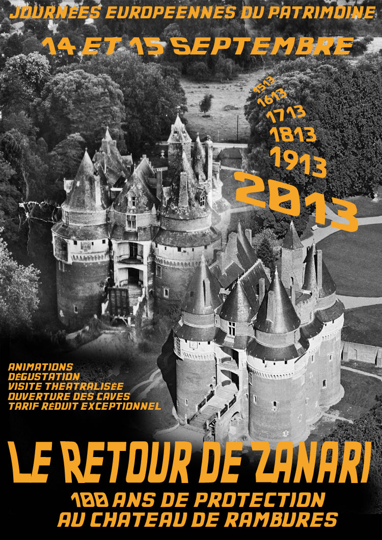 Promenade en calèche dans le parc à l'anglaise. "Conférence-promenade" de Monsieur Jean Baboux dans les jardins : William Henry White, architecte anglais du Château de Bizy. Samedi 14 à 15h et dimanche 15 à 10h30. Les visites guidées de l'intérieur du château auront lieu toutes les demi-heures de 10h à 17h. Tarifs : Visite guidée du château et visite libre des jardins inclus : tarif exceptionnel de 5€ par personne et gratuit pour les moins de 18 ans. Visite libre des jardins uniquement : 4€ et gratuit pour les moins de 18 ans. Conférence-promenade : 4€ et gratuit pour les moins de 18 ans Promenade en calèche : 3€ Château Fort de Rambures, son Parc et sa Roseraiedu 14 septembre 2013 au 15 septembre 2013le retour de Zanari pour les journées du patrimoine